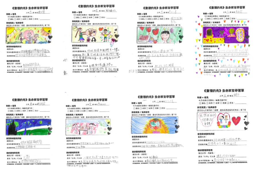 活動最後,同學們自由欣賞畫作,並領取由病童畫作製成的明信片,帶回家與家人分享感動;同時完成《畫裡的光》學習單,記錄自己的感受與體悟。透過藝術、分享與書寫,本次畫展不僅是一場展覽,更是一堂深刻的生命教育課程,讓孩子在心中種下一顆名為「愛」的種子。
